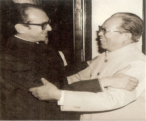 图上:1981年9月,国务院副总理兼外交部长黄华迎接来访的哥伦比亚外交部长莱莫斯